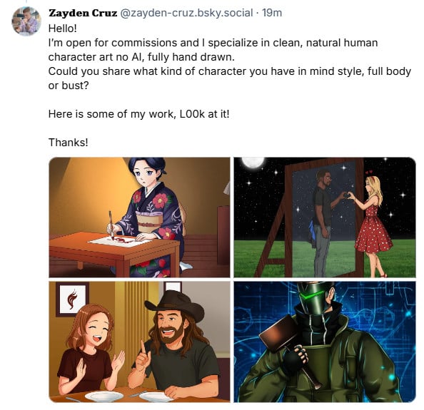 Browsing Bluesky, I stumbled upon a post from an artist warning people about a scammer stealing art for another artist.